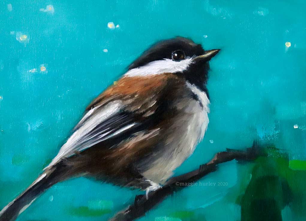 Oil painting of a chickadee with a teal sky and sparkles. Bird art by Maggie Hurley. Close up