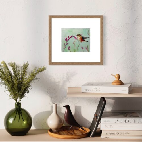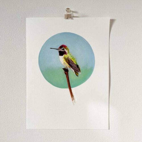 This is an original oil painting of a rufous hummingbird that paused in my backyard for a day or two before being run off by Mr. Floofy Pants (an Anna’s hummingbird who doesn’t tolerate visitors).