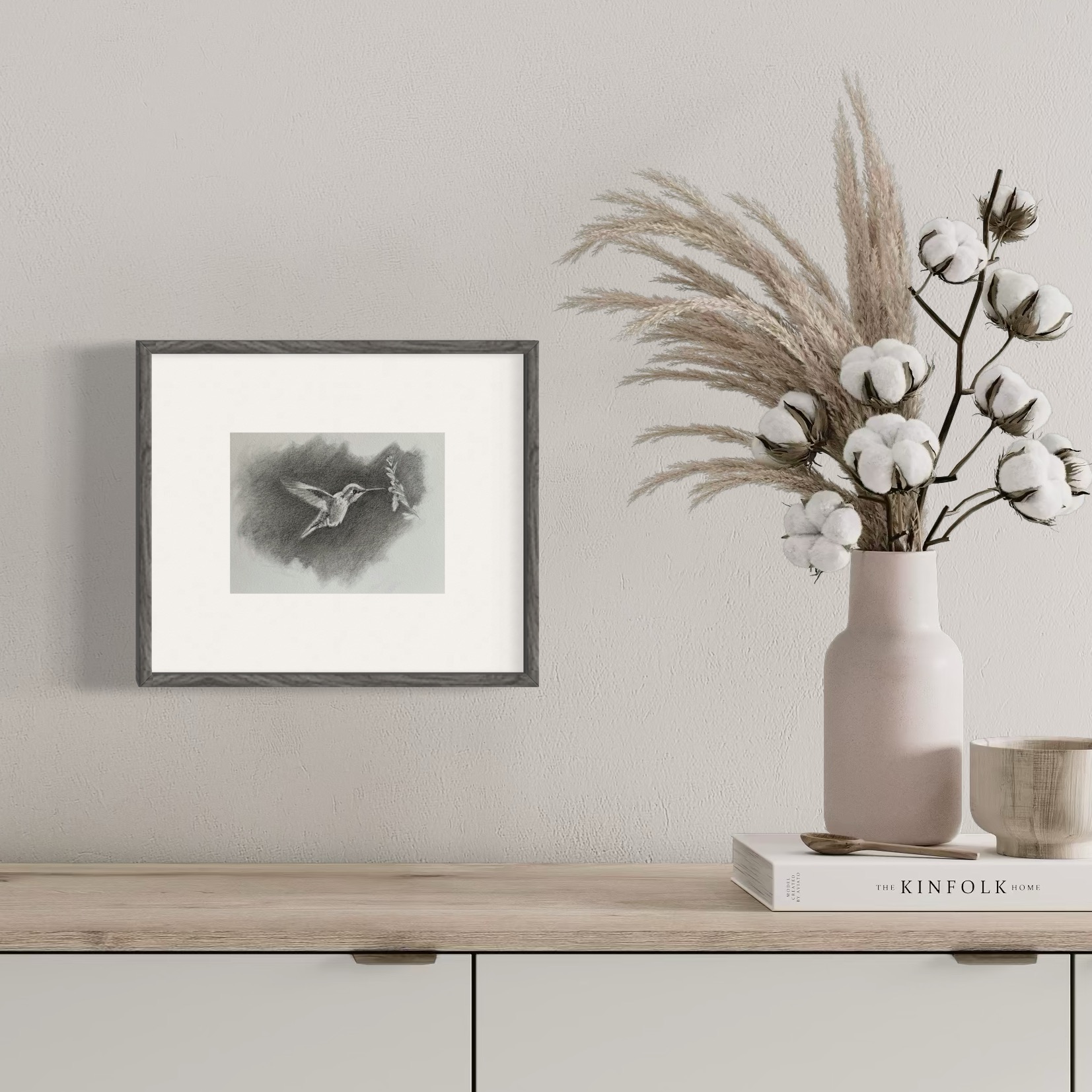 This is an original graphite and charcoal drawing of an Anna’s hummingbird in flight. One of the regulars in my yard.