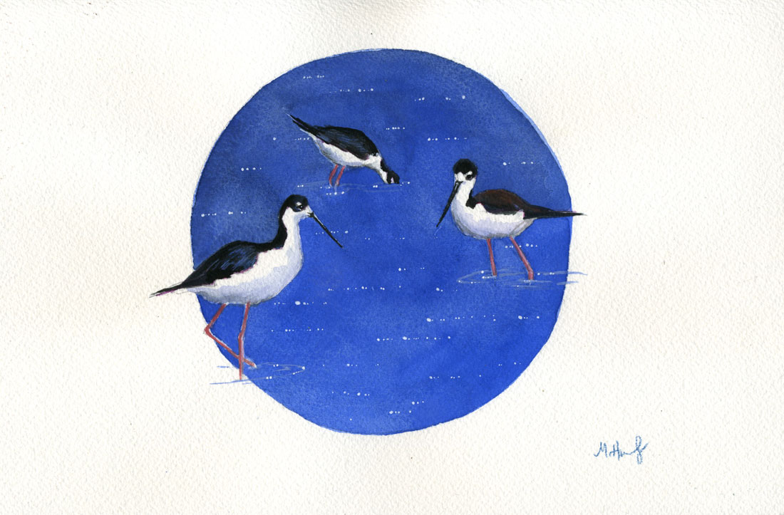 This is an original watercolor and gouache painting of 3 black-necked stilts.