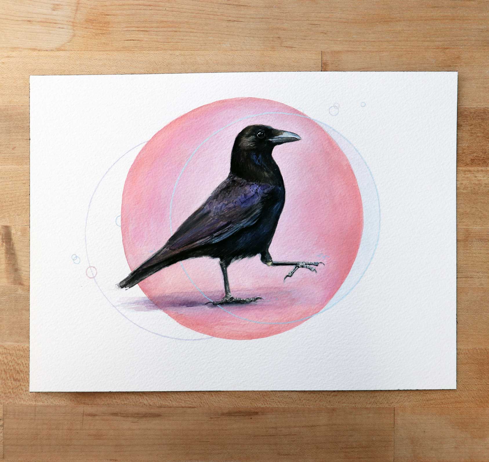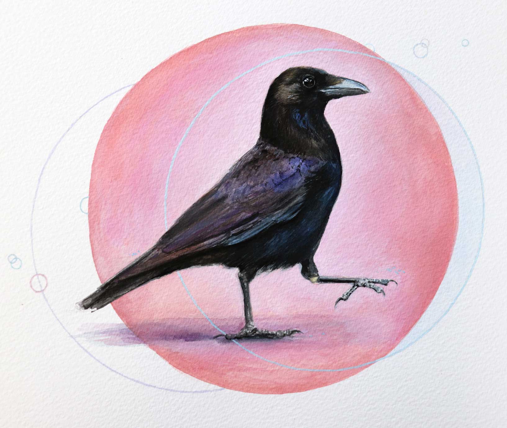 Crow in Pink | 9″ x 12″ | Gouache Painting