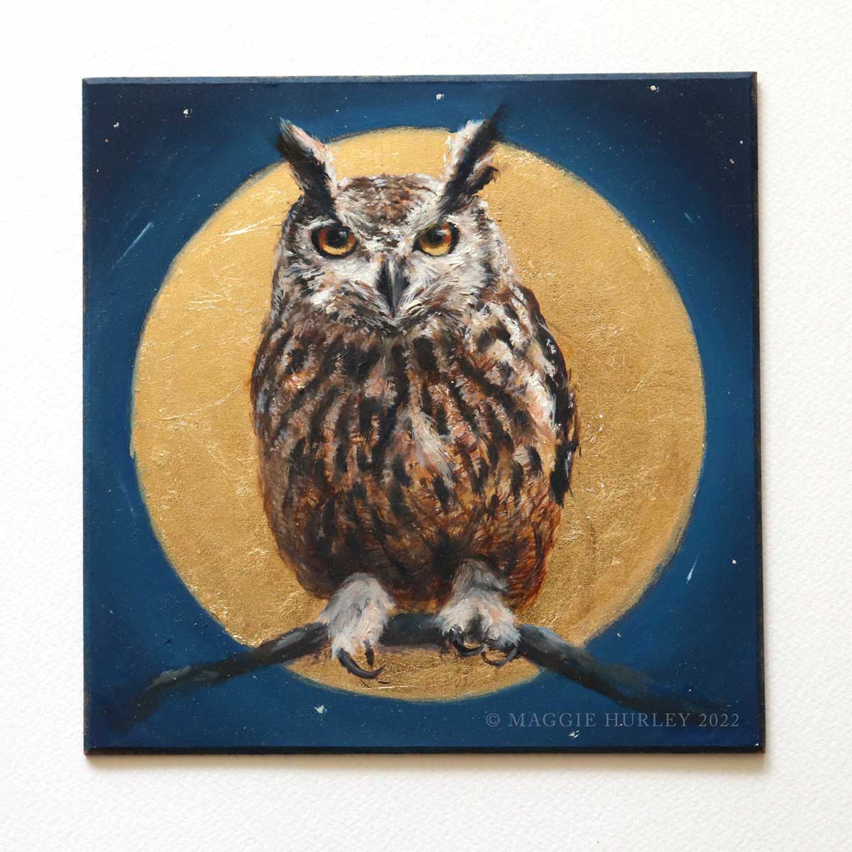 Eurasian Eagle Owl | 6″ x 6″ | Oil Painting + Gold Leaf