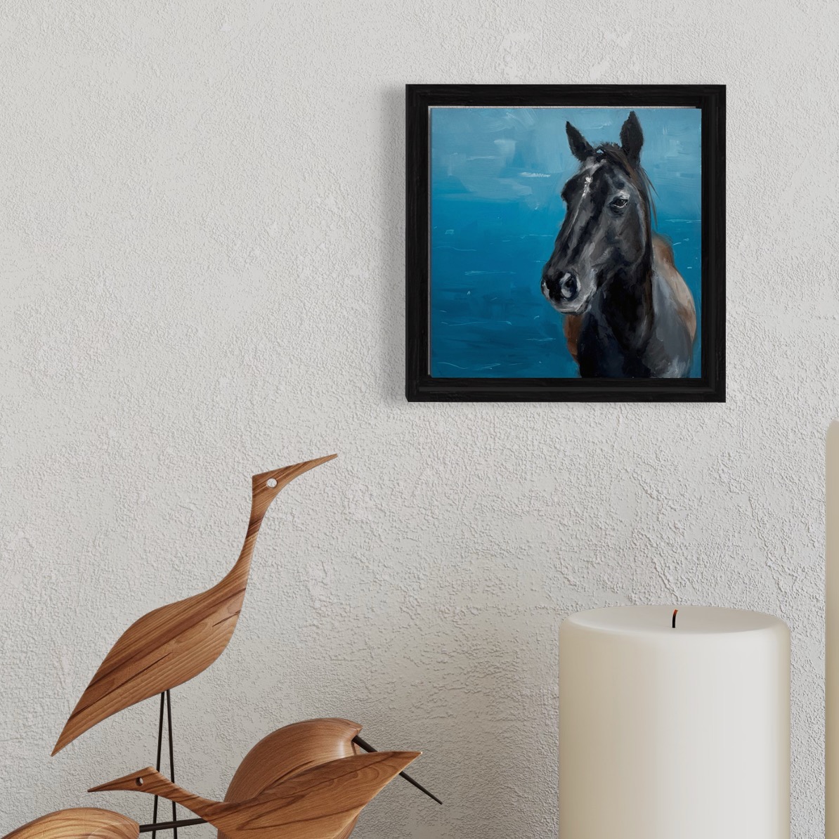 This is an original oil painting of a dark horse with an abstract blue background. Is it the sea? Is it the sky? Is it both? That’s up to you.