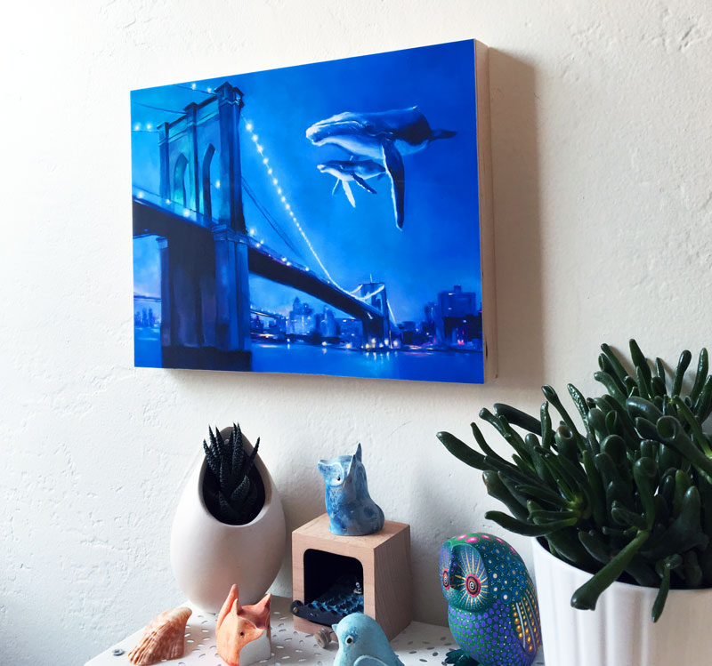 Dreamy surreal painting by Maggie Hurley featuring two humpback whales at the Brooklyn Bridge in New York displayed mounted on wood