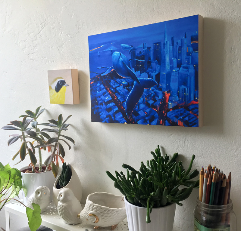 Wayward Whales at the Transamerica Pyramid by Maggie Hurley hanging on a wall