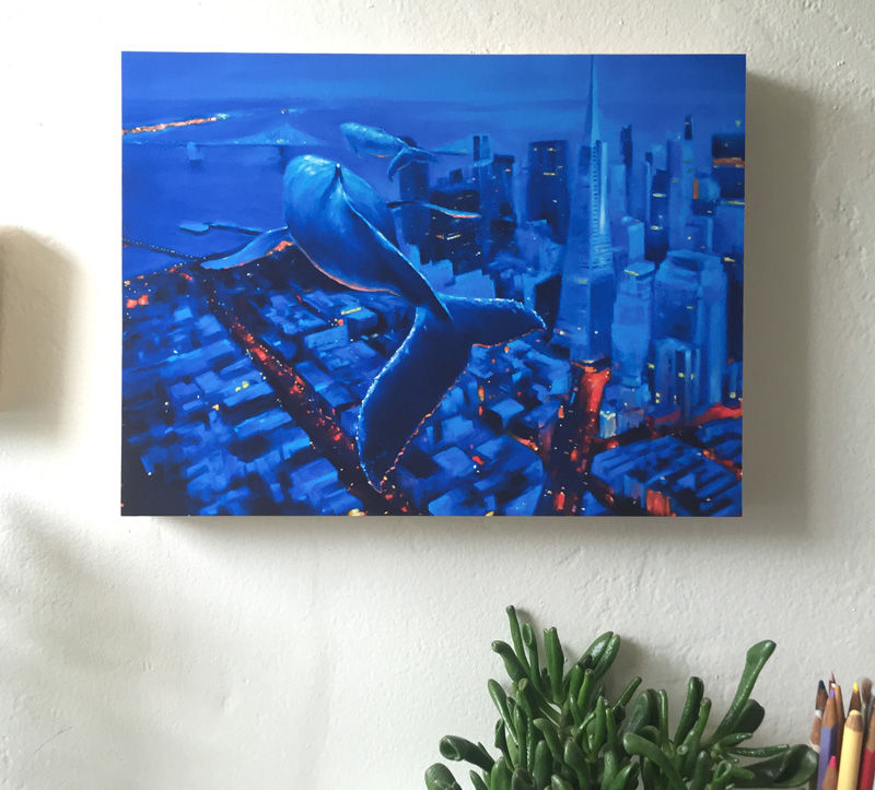 Wayward Whales at the Transamerica Pyramid by Maggie Hurley hanging on a wall